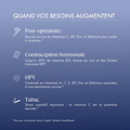 Contraception hormonale (pilule) & micronutrimentsShere M., et al. (2015)Association Between Use of Oral Contraceptives (OC) and Folate Status: A Systematic Review and Meta-Analysis➡ Méta-analyse (17 études, n=2 831) : la pilule est associée à une baisse significative du folate plasmatique (-1,27 µg/L) et du folate érythrocytaire, suggérant des besoins accrus en vitamine B9. Fallah S., et al. (2009)Effect of contraceptive pill on the selenium and zinc status of healthy subjects➡ Étude clinique : les utilisatrices d’OC présentent une diminution significative du zinc sérique (p ≤ 0,009), pointant un risque de statut plus bas en zinc sous pilule.Kamp F., et al. (2011)Effect of oral contraceptive use and zinc supplementation on zinc, copper, iron status➡ Données cliniques : les OC diminuent le zinc (et ↑ cuivre/fer) ; une supplémentation en zinc peut améliorer l’équilibre des oligo-éléments chez les utilisatrices.Palmery M., et al. (revue)Oral contraceptives and changes in nutritional requirements➡ Revue : les OC sont régulièrement associés à des altérations des statuts en vitamines B2, B6, B12, C, E et minéraux (magnésium, sélénium, zinc), plaidant pour une vigilance micronutritionnelle.Tabac & antioxydants Lykkesfeldt J., et al. (2000)Ascorbate is depleted by smoking and repleted by moderate supplementation➡ Classique de référence : chez les fumeurs, la vitamine C est l’antioxydant plasmatique spécifiquement déplété, justifiant un apport accru.Astori E., et al. (2022)Antioxidants in smokers (review)➡ Revue : les fumeurs bénéficient d’apports antioxydants (alimentation/suppléments) pour réduire le stress oxydatif lié au tabac.Alsharairi N.A. (2022)Dietary Antioxidants and Lung Cancer Risk in Smokers (review)➡ Revue : les fumeurs présentent des niveaux plasmatiques plus faibles de β-carotène, lycopène, vitamine E, vitamine C, sélénium, soulignant des réserves antioxydantes amoindries.Heitzer T., et al. (1996)Antioxidant Vitamin C Improves Endothelial Dysfunction in Chronic Smokers➡ Donnée physiologique : la vitamine C améliore la fonction endothéliale chez les fumeurs chroniques, soutenant l’intérêt d’un statut suffisant. HPV & statut micronutritionnelFerrari F.A., et al. (2023)The Role of Micronutrients in Human Papillomavirus Infection and Cervical Cancer (review)➡ Revue : plusieurs micronutriments (vitamines A, B12, C, D, E, K, zinc, sélénium, caroténoïdes) montrent un rôle potentiel protecteur aux différentes étapes de l’histoire naturelle liée au HPV (infection → dysplasie).Zhang P., et al. (2025)Composite Dietary Antioxidant Index (CDAI) and HPV Infection (NHANES)➡ Analyse populationnelle US : un score antioxydant alimentaire plus élevé est associé à moins d’infection HPV, suggérant l’intérêt d’un apport antioxydant global. Medina-Contreras O., et al. (2020)Immunonutrition in Cervical Cancer: Immune Response and Clinical Outcomes (review)➡ Synthèse : folates, rétinol/vitamine A, lycopène et autres nutriments sont associés à un moindre risque d’HPV persistant et de progression des lésions, appuyant une optimisation micronutritionnelle. ScienceDirectCicatrisation / Post-opératoire & micronutrimentsBechara N., et al. (2022)A Systematic Review on the Role of Vitamin C in Tissue Healing➡ Revue systématique : la vitamine C améliore certains résultats de cicatrisation (notamment escarres), confirmant son rôle clé dans le collagène et la réparation tissulaire.Janis J., et al. (2021)Evidence-Based Nutritional Interventions in Wound Care (review)➡ Revue : plusieurs études rapportent des améliorations de cicatrisation avec vitamine C et zinc (et parfois arginine/folate), soutenant des apports ciblés en contexte de plaies. drjeffreyjanis.comEllinger S. (2009)Efficacy of vitamin supplementation in situations with increased requirements➡ Revue : en situations de besoins accrus (plaies/ulcères), des protocoles combinant vitamine C + zinc (+ arginine) améliorent la prévention/guérison des plaies ; données chirurgicales encore limitées mais prometteuses. Wound Repair & Regeneration / J Hum Nutr Diet (essais variés)Nutritional Supplements in Wound Healing (brief + RCT list)➡ Synthèse (essais) : vitamine C, zinc et formules orales spécialisées montrent des bénéfices sur temps de cicatrisation et qualité des plaies dans plusieurs études cliniques.Wound Repair Regen (2024)Prospective Evaluation of Vitamin C, D, and Zinc on Time to Healing➡ Cohorte prospective : statuts en vitamines C/D et zinc corrélés au temps de cicatrisation des plaies du pied, plaidant pour une optimisation micronutritionnelle. Liebert PublishingMemoire & MicronutritionDev S. (2009) – Essai clinique, 750 mg/j oral➤ Amélioration significative des scores de mémoire logique et associative après 60 jours.Diniz L.R.L. et al. (2023) – Revue pharmacologique➤ Confirme les effets de l’asiaticoside et de l’acide asiatique sur collagène, angiogenèse, inflammation et cicatrisation.